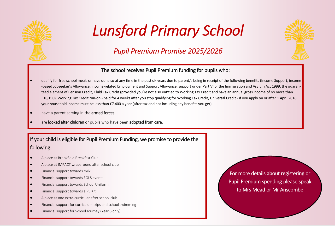 At Lunsford Primary School we are committed to improving the outcomes for pupils that are eligible for the Pupil Premium funding. Below you will find our Pupil Premium strategy which outlines how the funding is spent and the impact this has on outcomes for pupils. You will also find our Pupil Premium Promise which explains what we promise to provide for all pupils that are in receipt of the Pupil Premium grant.